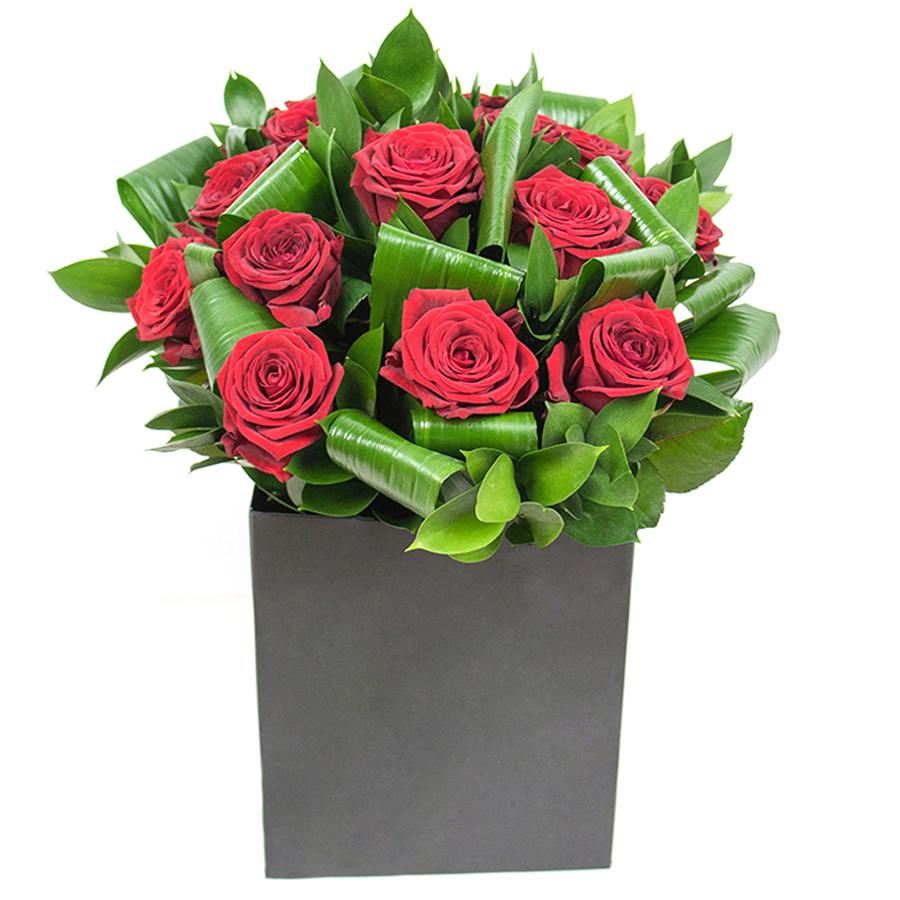 Enhance your living space with our chic red rose blossom arrangement, a perfect combination of vibrant reds and lush greenery.
